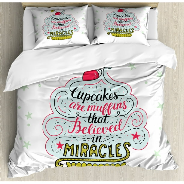 Funny Words Queen Size Duvet Cover Set Artful Cupcake Motif With Cherry On Top Believe In Miracles Phrase Bakery Theme Decorative 3 Piece Bedding Set With 2 Pillow Shams Multicolor By Ambesonne